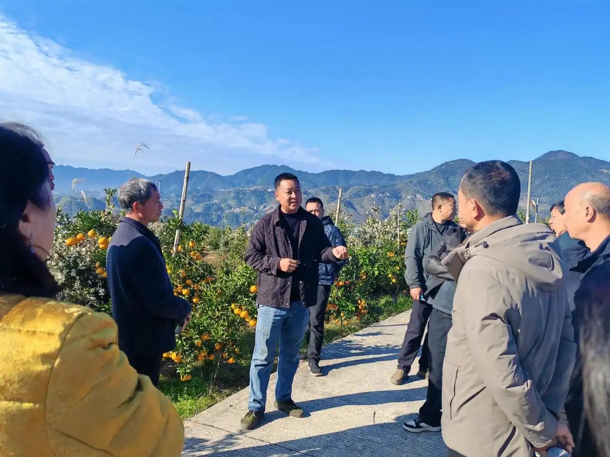 考察现场,视线所及的是漫山遍野的橙子树和油茶树,满目葱茏的橙树硕果盈枝,呈现出一派生机勃勃的景象。据了解,10多年前,周贵员在东北从事柑橘类水果批发生意,凭借敏锐的市场洞察力,他的生意做得风生水起,年销售额从几百万逐渐攀升至三千多万元。2017年,周贵员返乡创业,投资700万元成立了新邵县湘辰农业发展有限公司,公司流转了800亩山地,通过“合作社+农户”的模式,吸纳20余名村民就近务工,现已发展湘橙种植面积600余亩,今年产量达17.6万斤,今年产值达80余万元。他与东北的客户建立了长期稳定的合作关系,并积极拓展线上销售渠道,让大新的橙子走向更广阔的市场。在今年11月刚刚结束的第二十六届中国中部(湖南)农业博览会上,周贵员的红美人果冻橙被授予“产品金奖”荣誉称号。