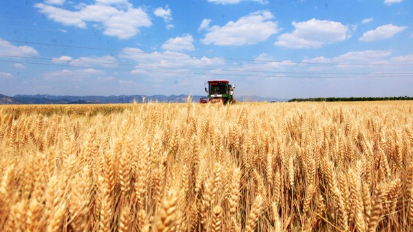 去年5月24日,临沂市平邑县农民驾驶收割机收割小麦。新华社发