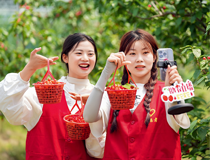 2025年4月28日,浙江省湖州市,长兴县泗安镇中心幼儿园志愿者通过网络直播平台帮果农销售樱桃