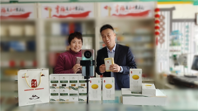 图为客户经理协助零售户直播销售特色农产品“火山农八鲜”