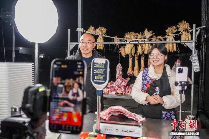 彭家沟村党支部书记焦宪(左)进行直播带货(资料图)。受访者 供图
