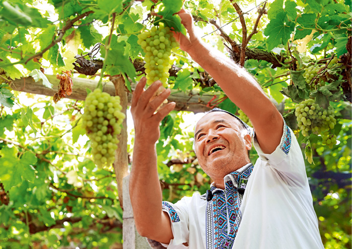 2025年9月10日,新疆吐鲁番葡萄沟景区,“网红村民”吾买尔·热西提在自家院子里摘葡萄