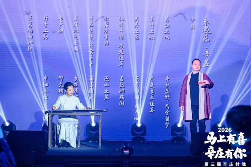 作为辛庄文化IP 打造的关键一环,本届村晚以“传统与现代共生、星光与烟火相融”为特色,构建起一台彰显新乡村气质、饱含振兴情怀的文化盛宴。国家级非遗常山战鼓《迎春》气势磅礴,拉开晚会序幕;辛庄南山京剧社带来的经典京剧选段,展现了传统文化在乡村的传承活力;古琴演奏《酒狂》与原创朗诵《永遇乐・辛庄》跨界融合,勾勒出农耕文明与现代文明的和谐共生图景。