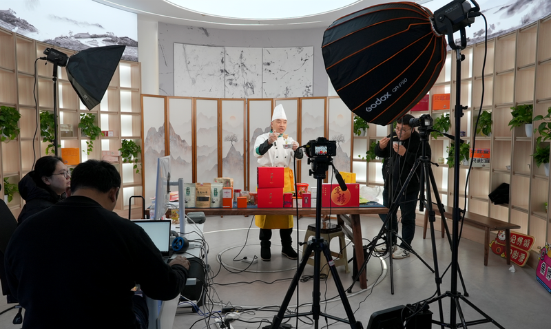 直播现场,补光灯、高清摄像头、环形麦克风等设备一应俱全,展架上陈列着各类特色产品,直观呈现出数字贸易赋能乡村产业的鲜活场景。