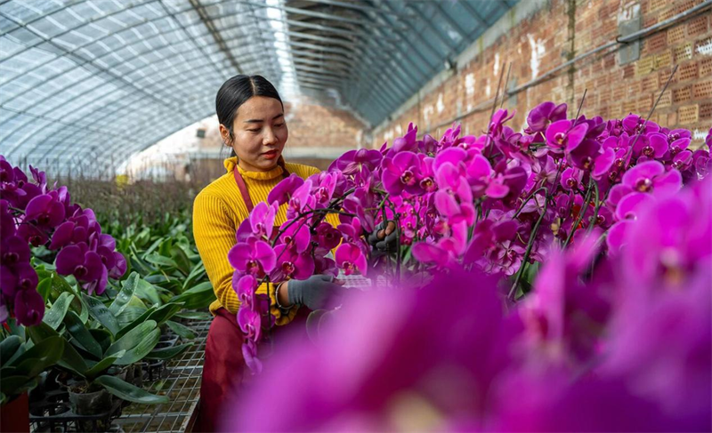 推开临洮县衙下集镇联合村蝴蝶兰种植基地的温室大门,温润的暖意裹挟着淡淡幽香扑面而来。村民王萍花俯身在一排紫红色蝴蝶兰前,用小巧的喷雾器为花瓣轻洒水雾。“你看这株‘满天红’,马上要装箱发往上海了,得让它精神点儿。”她笑着对记者说,“这一片花都是我管护的,去年靠这份工作挣了将近3万元。”